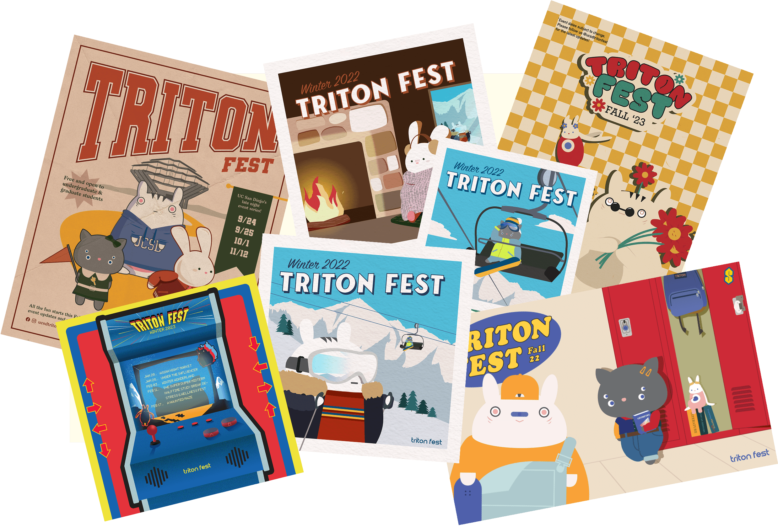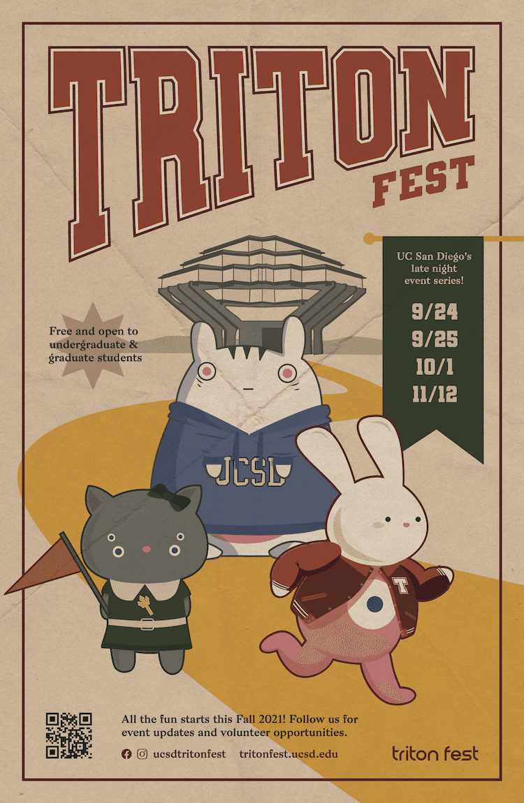 I directed the creative direction and designed digital, print, and web graphic material for 5 different Triton Fests, each with a different theme. I had the opportunity to work alongside event coordinators, web developers, marketers, and talents to push out these graphics for our campus community of over 35,000 students.